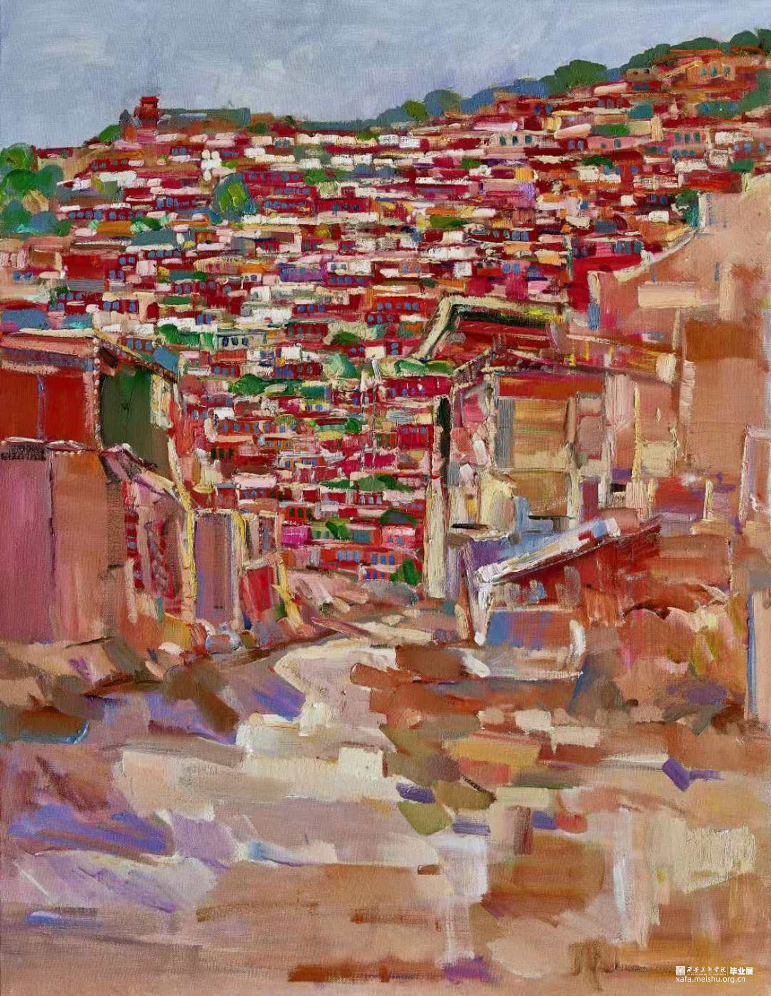 整个五明佛学院建在一条叫喇荣的沟里,喇荣就是:一到那里就想出家的意思。开进佛学院,我只能用震撼来形容,它四面环山,就一条路蜿蜒而上,四面的山连着蓝天,高高的坡上全是房子,密密麻麻,层层叠叠的排列着,彼此之间连一米的空隙都没有,每座小房子都只有三五米长,二三米宽,估计只能容一个人躺下。那里有些是几代人一直住在这里,有些是从出生到二三十岁都没出去过。沿着蜿蜒的小路有几家很昏暗的小店,小店里的生活用品到也比较丰富,牛奶、饼干、日常的生活用品基本上都有,如小型超市一样 ,很少见到几个人聚在一起聊天,他们或者在建房,或者在边走边诵经,或者在神坛转经。由于强烈的紫外线照射,使他们的脸变得黝黑,年龄大的就布满了沟沟壑壑,显得饱经风霜,大部分人走路的姿势都是低头背弓。
