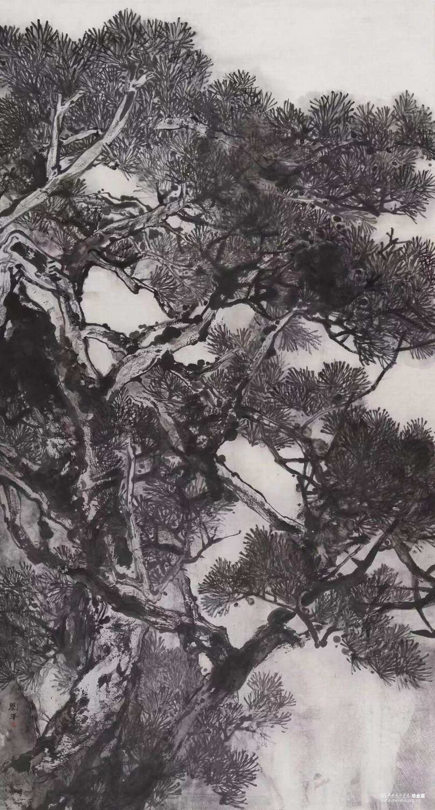 画面中以一棵姿态苍劲挺拔的苍松为主景,用水墨表现树干和枝叶的穿插关系,远景为隐隐约约的流水。松树这种耐严寒和四季常青的特点,像极了一位勇士,守护着祖国的绿水青山。