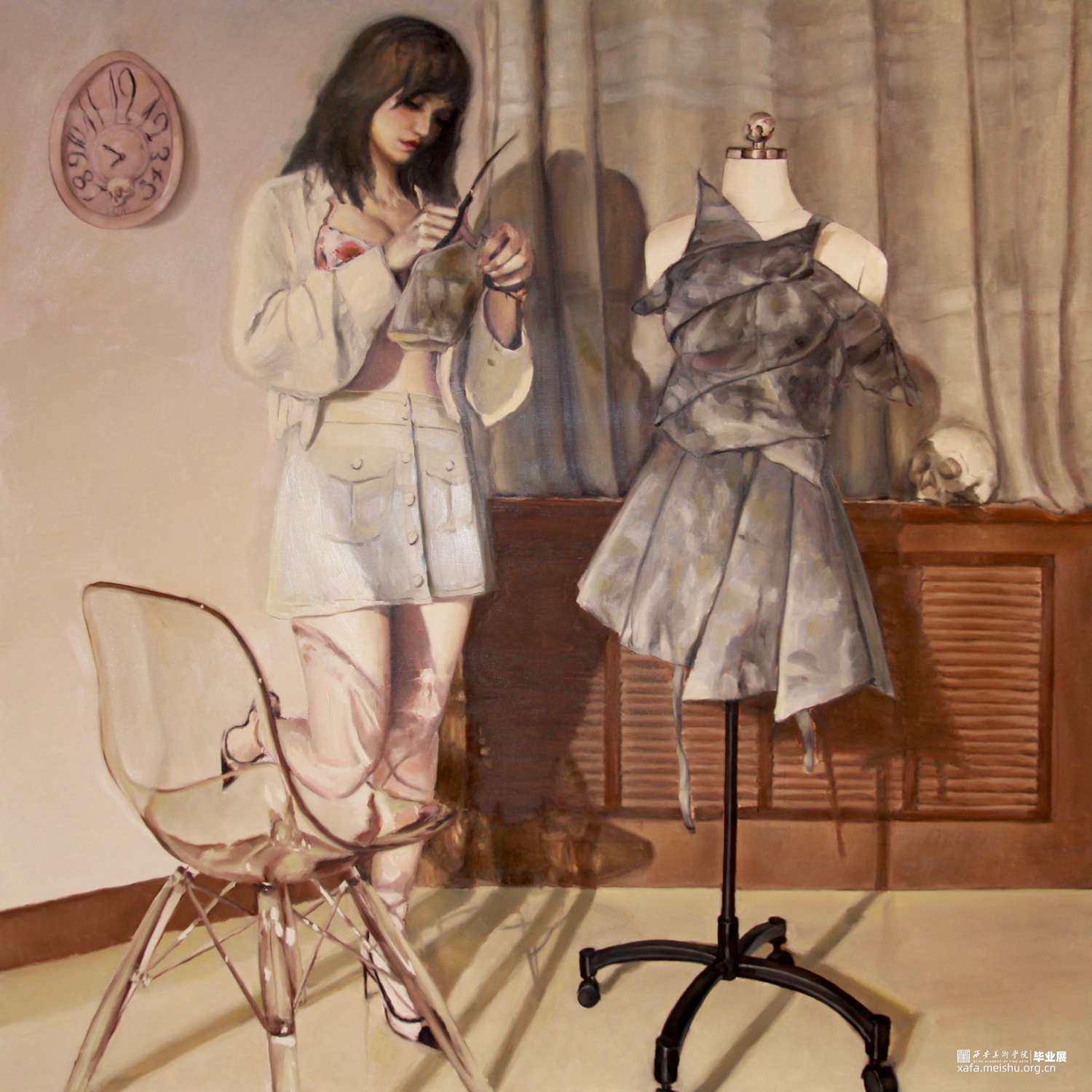 毕业创作既是大学四年课程的总结,也是这四年生活体验的总结。所以我在绘画内容上选择了这四年最重要的课程安排——人体写生,算是对自己这四年绘画技术的检验;在主题上,我选择了关于梦想和创作的倾向——年轻的服装设计师,以传递给观众一种青春和梦想的意向。