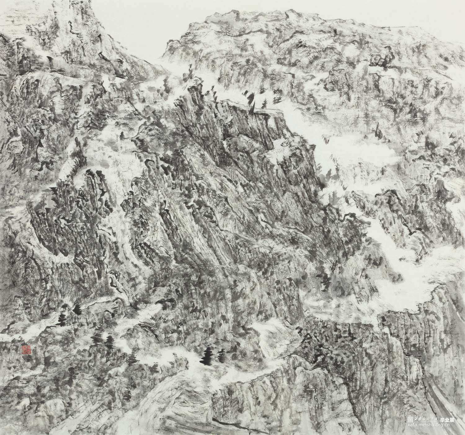 我的创作初衷是一幅八尺的写生转换构图,采用高远法。刚开始凭着对陕北的感觉,趁热打铁干劲十足,画着画着空间出现了一系列大小问题,这才意识到画面整体构图和笔墨大关系,没有经过认真思考,对陕北的形象理解和把握不足导致随意性越来越明显。于是,在技法上重新尝试揉纸,多次干皴效果依旧不是很理想,从写生到回来三个星期过去了,一颗焦虑的心开始了躁动踌躇不前,最终结果就是不再有心灵的触动,不再有陕北情愫的涌现,此时这便是我内心深处最压抑的挣扎。