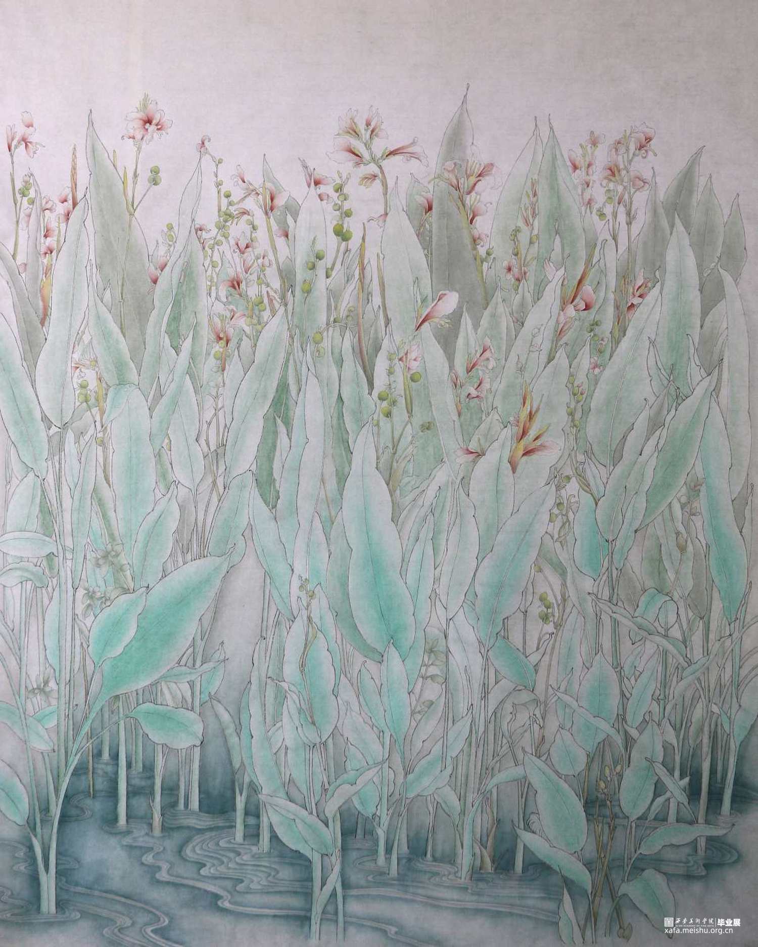 偶然间在路边看到了一大片的野生美人蕉,生长在水田里,欣欣向荣,狭长的枝叶和色彩鲜艳的花朵像没有雕琢过的润玉,自然而然的美,给我留下了很深的印象。用传统国画形式表现出来,表达了对自然的敬畏和热爱。