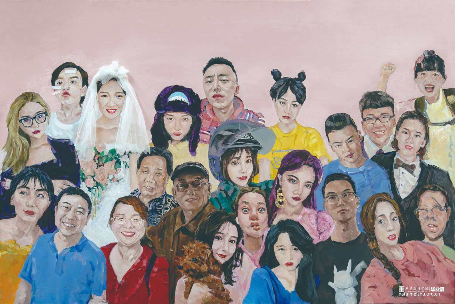 时间就像是一个不断更新的软件,它一点一点修改着我们对于亲人朋友的记忆,而朗格说过:“艺术是人类情感符号形式的创造。”我想,爱是永恒的主题。所以我想在23岁时将我记忆中最深刻的22个人和我自己用诙谐的表现手法留在画布上。照片会褪色,记忆也会随着时间的推移变得模糊,但画会一直留下来弥补那些记忆的空缺。创作开始之时,虽然我手上有不少他们的照片,但最终我决定将自己记忆中他们的模样呈现在画布上。在开始构思时,我画了很多的草图,关于服饰还有色彩搭配,以及画面中的人物构图,笔触都进行了很多的尝试,最终确定用漫画式的表现手法记录下这些对于我很重要的人们。也让画面可以变得轻松温暖。