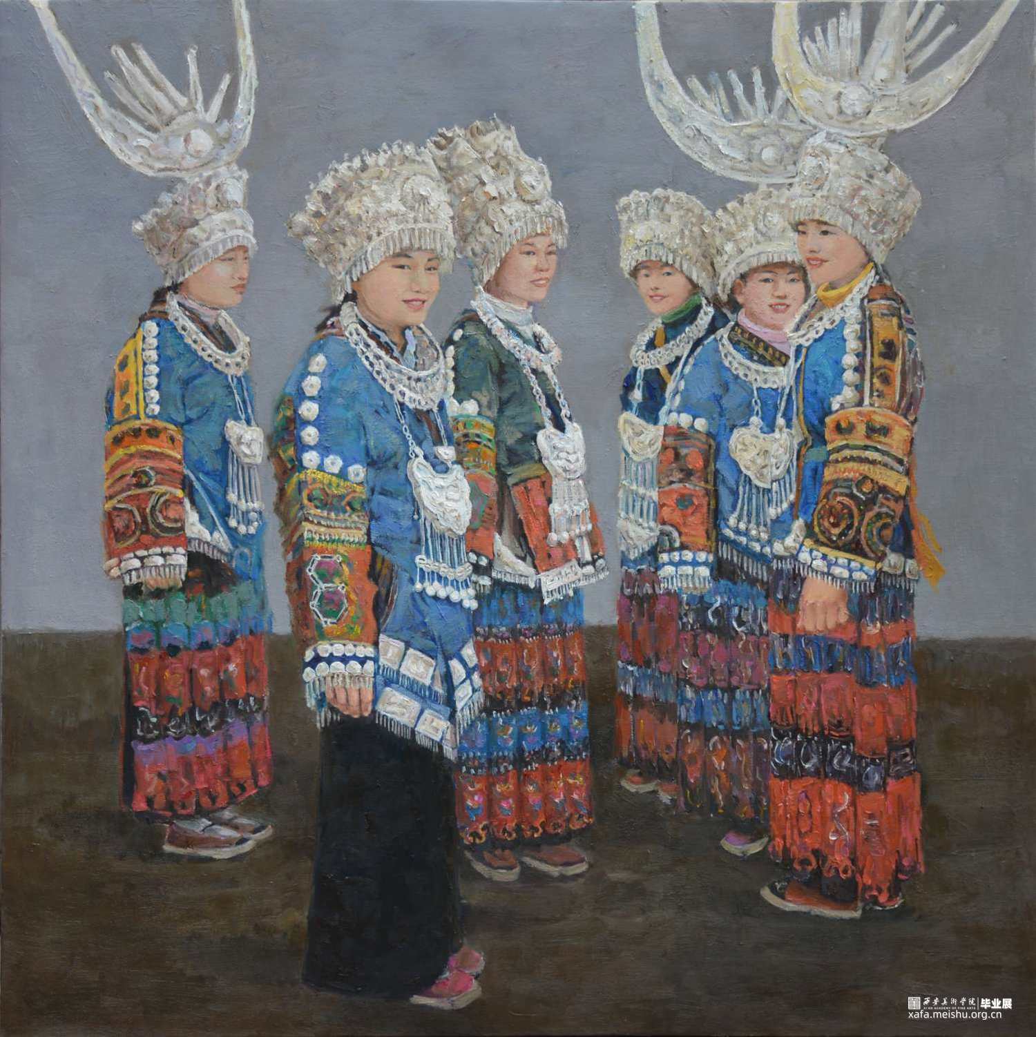 我的油画作品名为《苗族印象》,苗族,在我的心中一直是一个很神秘的存在,激发了我的创作灵感。苗族是一个古老的民族,他们的服饰是所有民族中最为华丽的,不同地区的苗族服饰也不一样。在创作过程中,我收集了大量的资料,研究了有关苗族的文化。画面取材于黔东南地区的苗族,他们的服饰特别好看,以银饰为主,画了6个美丽的妙龄女子,人物采用不同的站姿形成画面感,使整体画面带有一种神秘感。