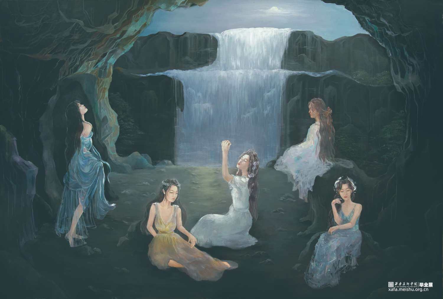 作品《空谷》,如此幽兰心境的女子不为俗世利欲得失所扰,寄悠独白,一派超然。画面中每个女孩子相互辉映,各有其美。