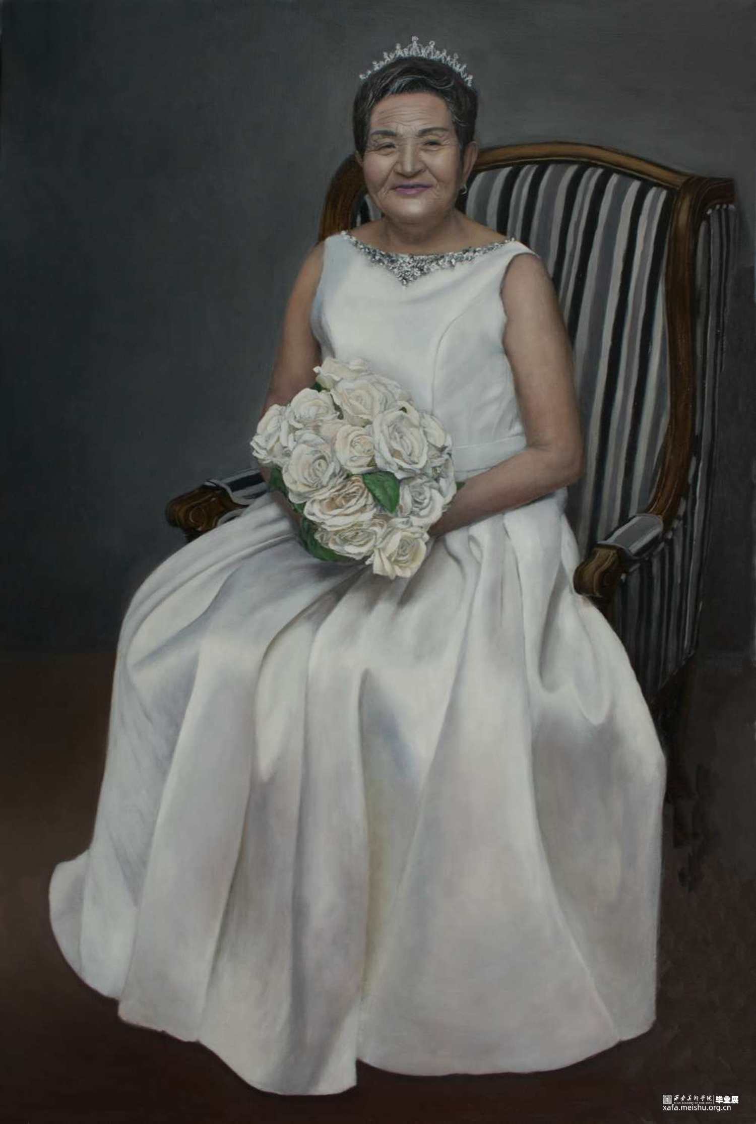 《爱》主人翁是作者的奶奶,她身着婚纱,手捧鲜花,安然的坐在木质沙发上,露出恬淡的微笑。画面运用古典油画的创作方式,对人物尽可能精细的刻画。这是一份特别的礼物,是作者心中的一段特别的爱及爱的反哺。