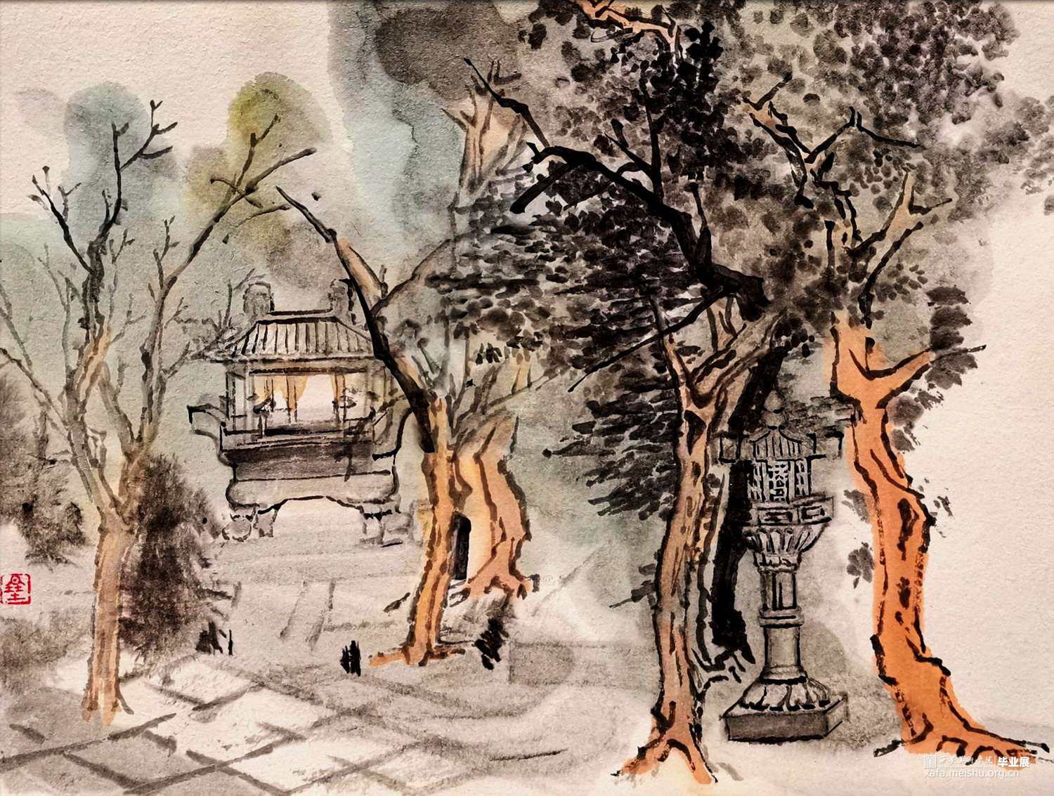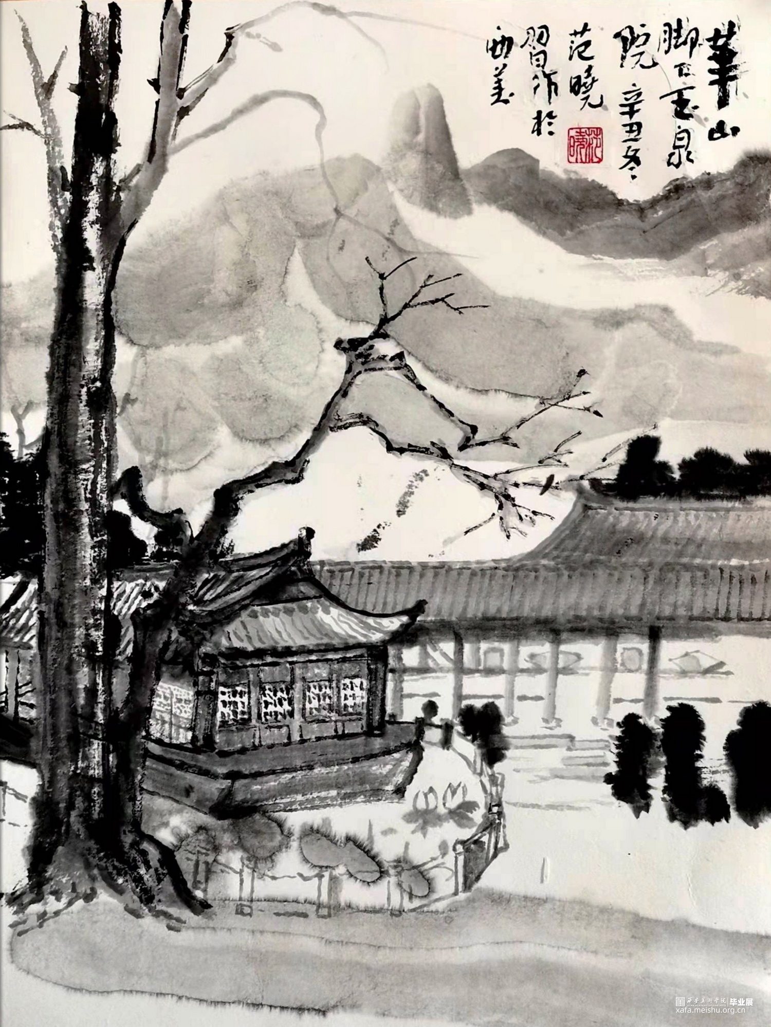 辛丑冬有幸华山写生,短短数日,领略到了华山的博大雄伟,更是被玉泉院内参天古树,亭台楼阁所吸引,精美的园林建筑与虬枝纵横的老树之间相互映衬,融为一体!感叹之余……提起情感之笔,用浓淡交融的水墨气息,创作了心中的“玉泉真境”。