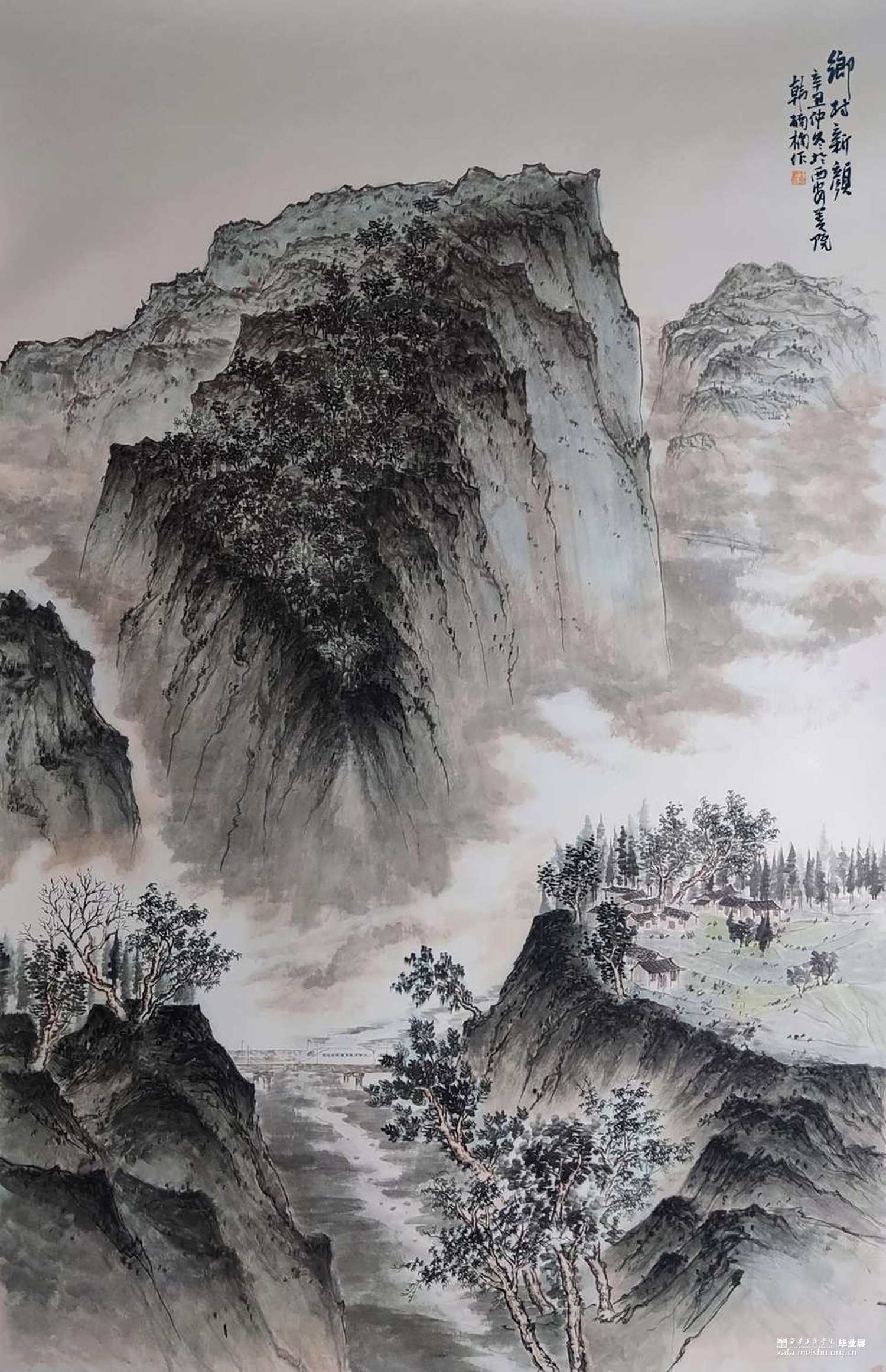 《乡村新貌》是2021年冬在西安美术学院而作。主要表现乡村的田园秀美、绿水青山、溪云、希望的高铁……。作者主要从事于铁路方面事业,家住西安周边秦岭山脉。描绘着铁路通向乡村,通向家乡。看到美丽的家乡能够得到更好地发展。民族要复兴,乡村必振兴。