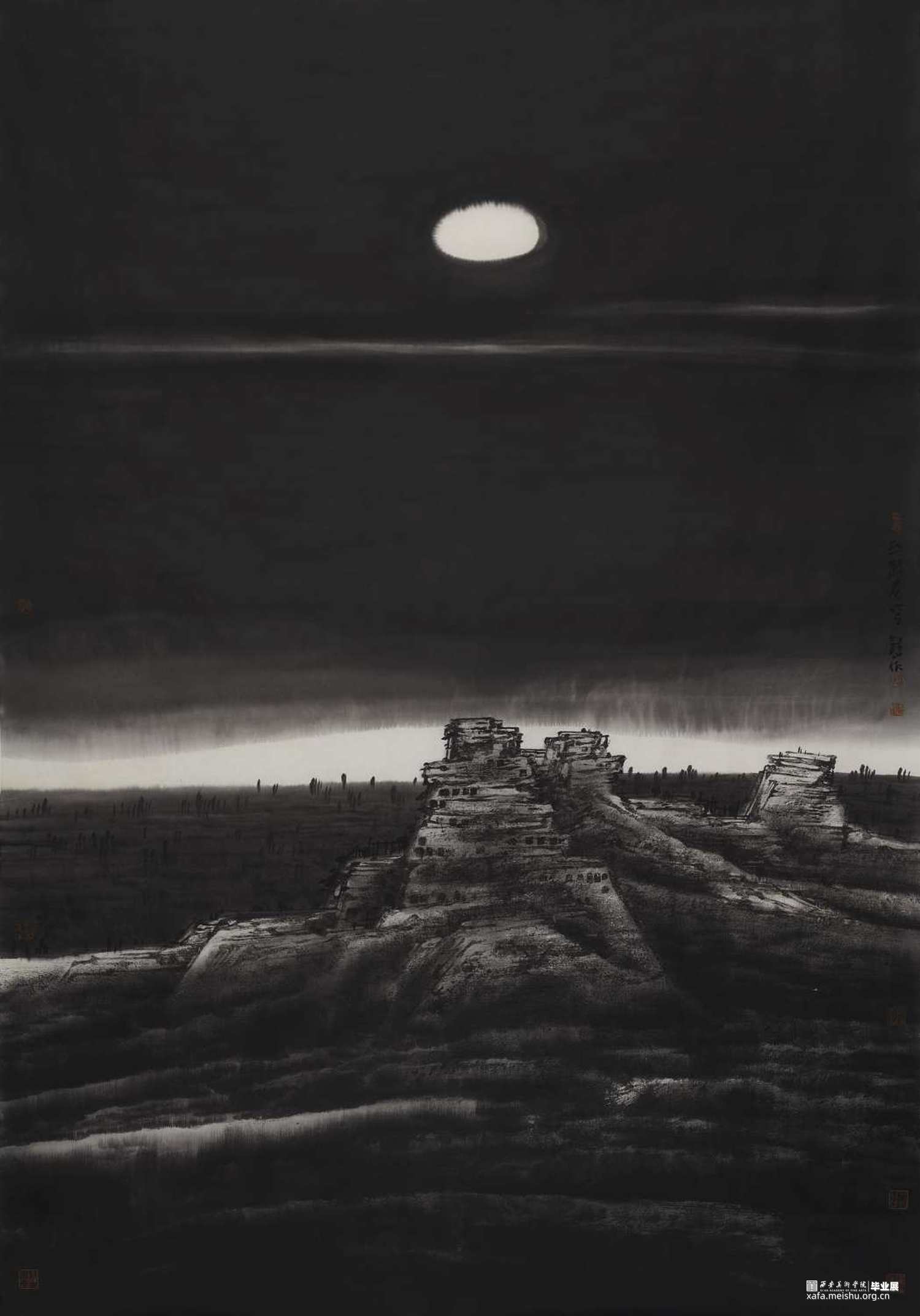 作品《丝路苍穹》,是我以古丝绸之路为历史背景,以苍凉、博大、浑厚、辽阔的西部地域为创作母体,以秦时明月汉时关为主要描写对象。运用强烈的黑白对比关系,挤压出古道神秘悠远的历史感,月亮的白和天地之间的分割线以及那一道涌动的天际流云,形成上下呼应,将画面的层次拉开,通幅以浑厚的墨色为主,在统一中求变化,用沉重的黑白相间处理手段,旨在给观者呈现出西部丝路古道沧桑的千年历史厚度和人文关怀,以及独特的地域地貌和表现手法。