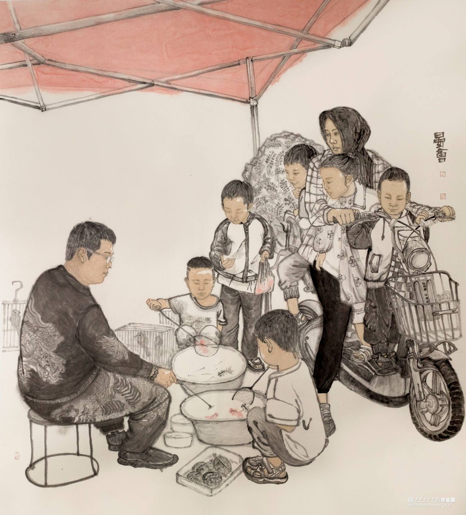 作品《童趣》采用了宿墨的笔墨形式和写实的画面构图来表现。以中锋用墨,丰富的表现出宿墨之笔趣,在墨痕、笔痕、水痕的可控与不可控之间,完成形神的追寻,在写实的作品中产生新的形式美感。