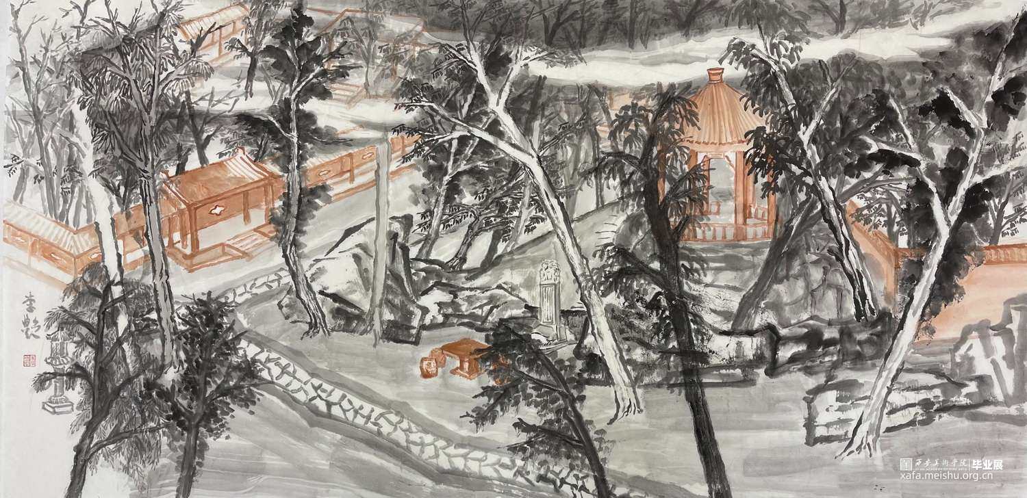 本作品是玉泉院写生的创作作品。亭台楼阁、构思巧妙;参天古木,绿隐蔽日,处处透露着这个道教古寺庙的神秘和静谧,唯美而苍远。