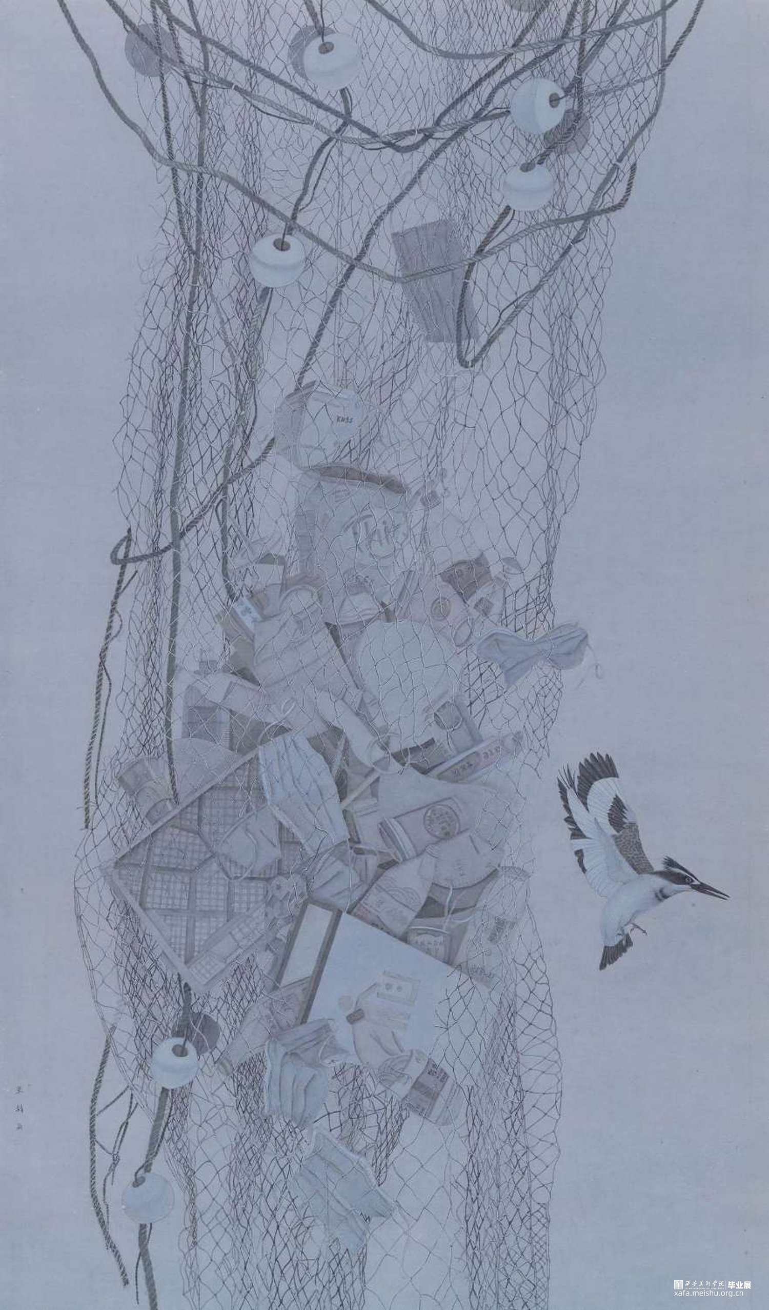 《渔曦静影》的创作灵感来源于一堆生活垃圾中更是我们所生活的环境,因疫情我们每个人都需要佩戴口罩随之而来的是疫情当下的生活垃圾也随之变多,甚至对水流海洋也造成了污染,渔网所代表的是一种束缚将我们的生活所网住,而正要飞走的鸟儿更加呼吁我们对环境的保护,更是人们想要尽快战胜疫情获得像往常一样的自由。从作品整体来看,整幅作品的颜色基调是蓝灰色,黑色的麻绳对应着白色的浮球与鸟的白色形成鲜明的黑白对比,而主体物为灰色其中包含塑料水瓶、口罩、垃圾桶、消毒的酒精塑料瓶、零食袋子等都是我们生活中常见的垃圾,更加呼吁人们对环境的保护。