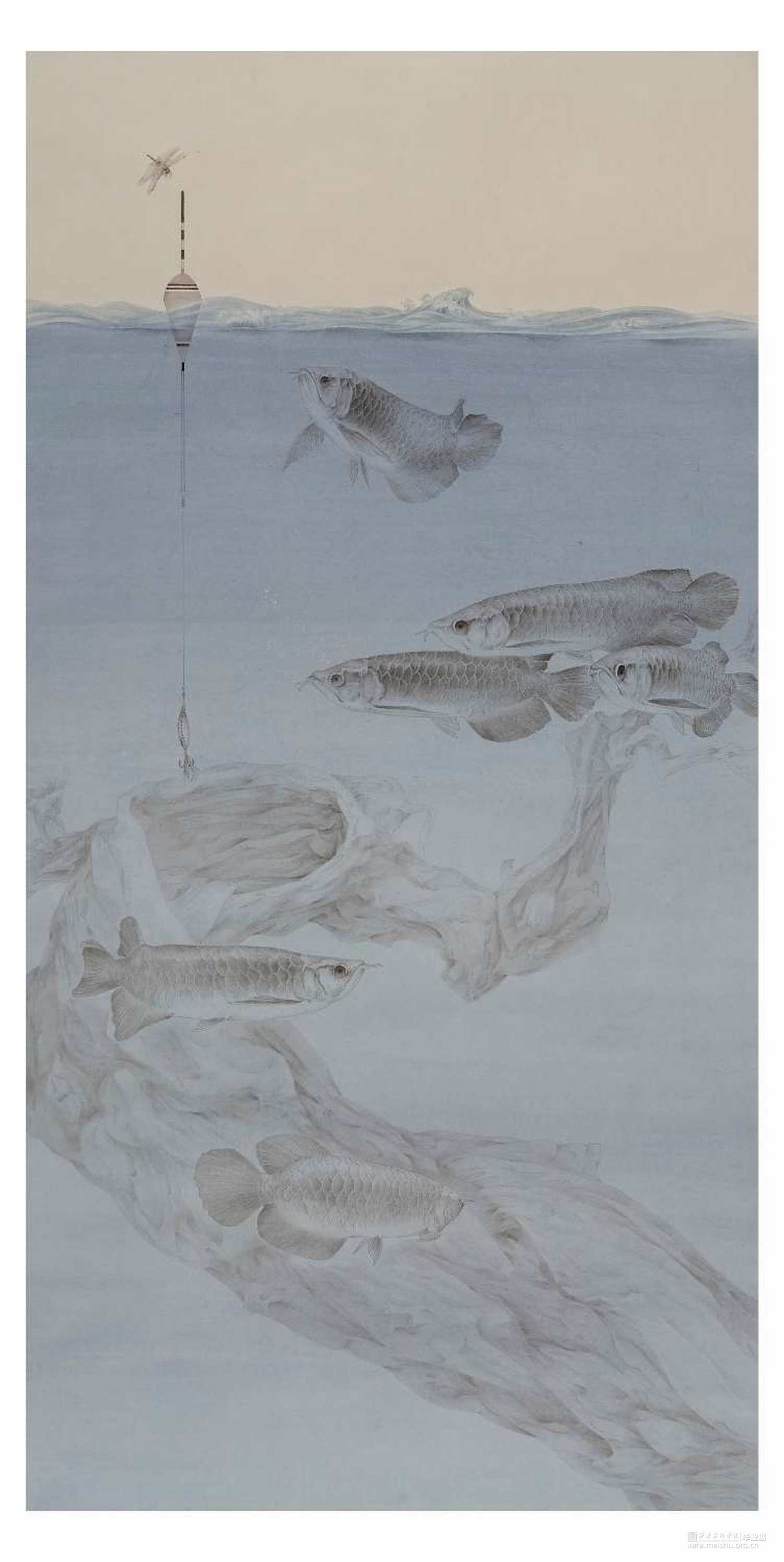 画面选取水的断面,水面布置在画面较高位置,即防止画面上部过空,又能使水面以下尽可能多的呈现,以留出足够的空间。整幅画中,鱼的部分可分为上下两大组,以聚散方式处理安排,辅以隐匿于背景之中的枯木,取其形势,为顶上的鱼增添形势。鱼无法言语,在面对诱饵时,又各怀鬼胎,互相猜疑。顶层的鱼仿佛有自己独立的思想一样,没有像他们一样,瞄准正欲停歇的蜻蜓,蓄势而出。