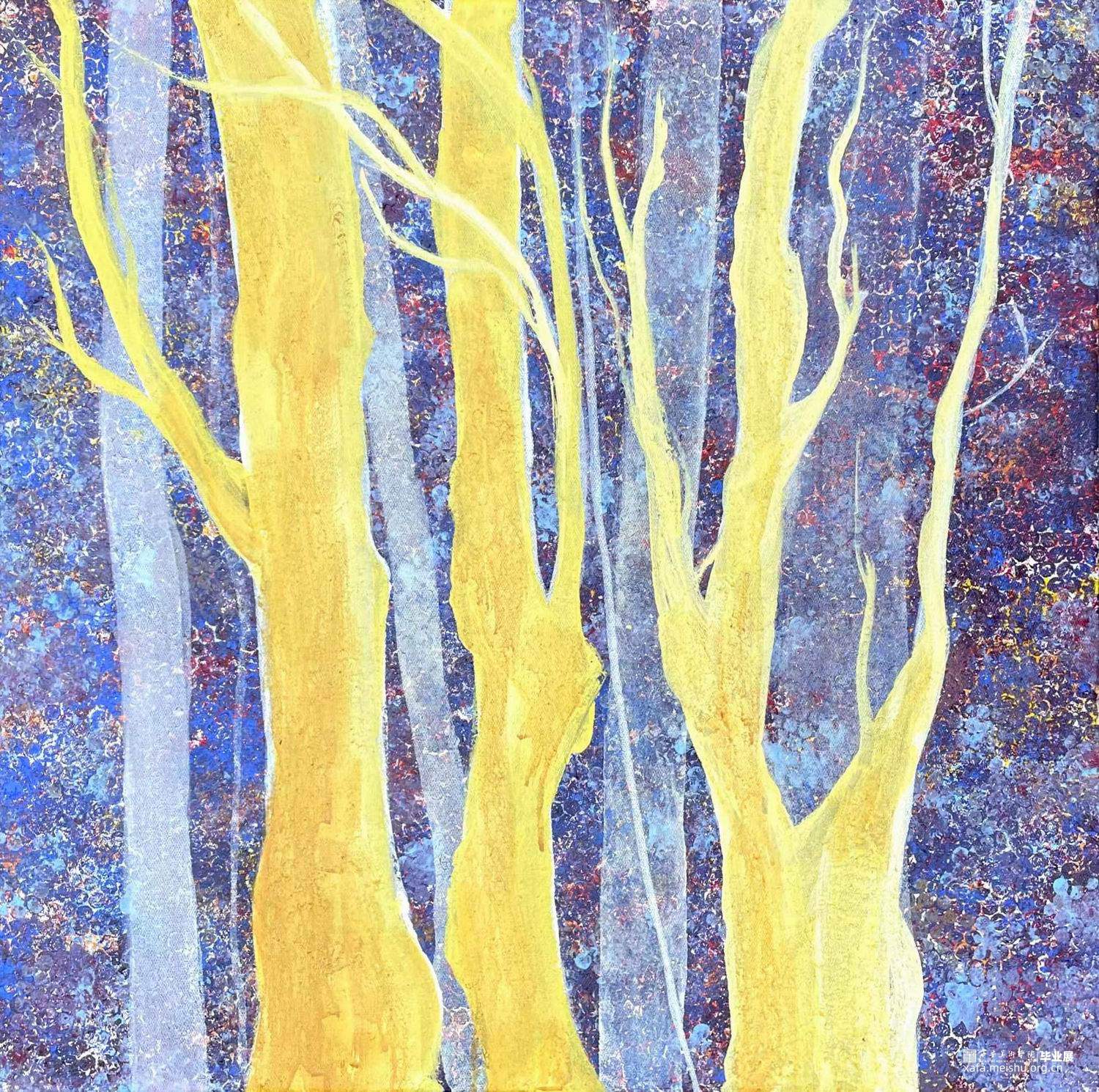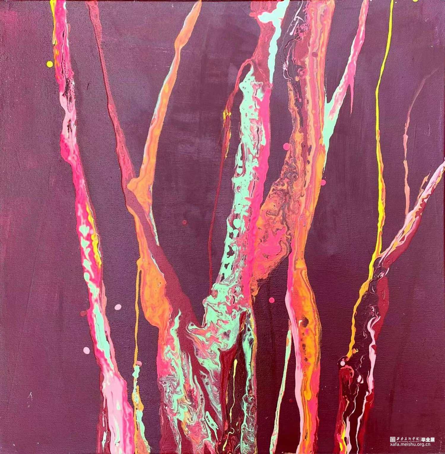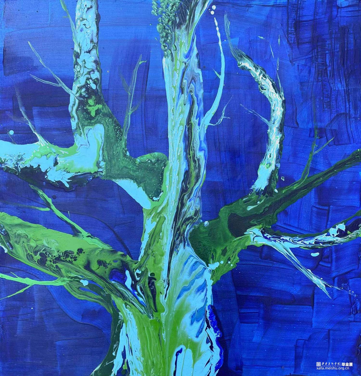 我的毕业创作是三张一组的作品,我的创作灵感来源于我家院子雨后水流过的痕迹,很像一颗参天大树也像错综复杂的河流,还有村口那棵巨大的核桃树,让我想到了旺盛的生命。我想能不能把树和河流及血管细胞结合起来表现“生命”,用树的颜色—绿色,河的颜色—蓝色,血管—红色,泥土—黄色,作为基调。用流体画的形式来表达其像树又似河流的那种感觉。有着艳丽眨眼的颜色以及像河一样具有流动性的树,代表着蓬勃不朽的生命。