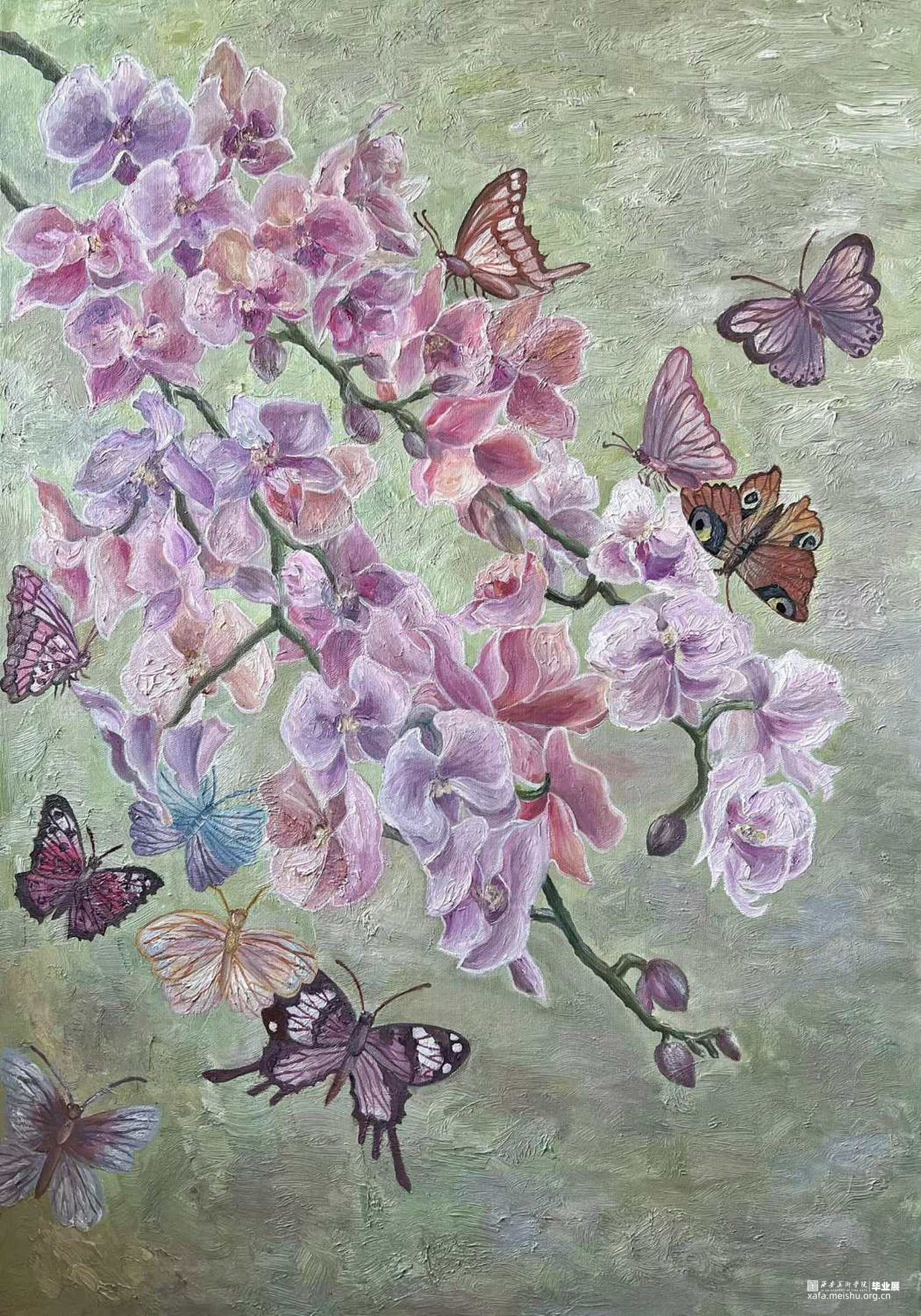 整幅作品以温柔浪漫的紫粉色为主,将我所爱的紫色、蝴蝶兰和蝴蝶三种元素联系在一起。紫色是对温柔最好的诠释。蝴蝶兰的花语是幸福来临。蝴蝶兰花型飘逸、花色柔美,吸引了许多向它飞舞而来的蝴蝶仙子,固然,有蝴蝶的地方就有幸福飞来。