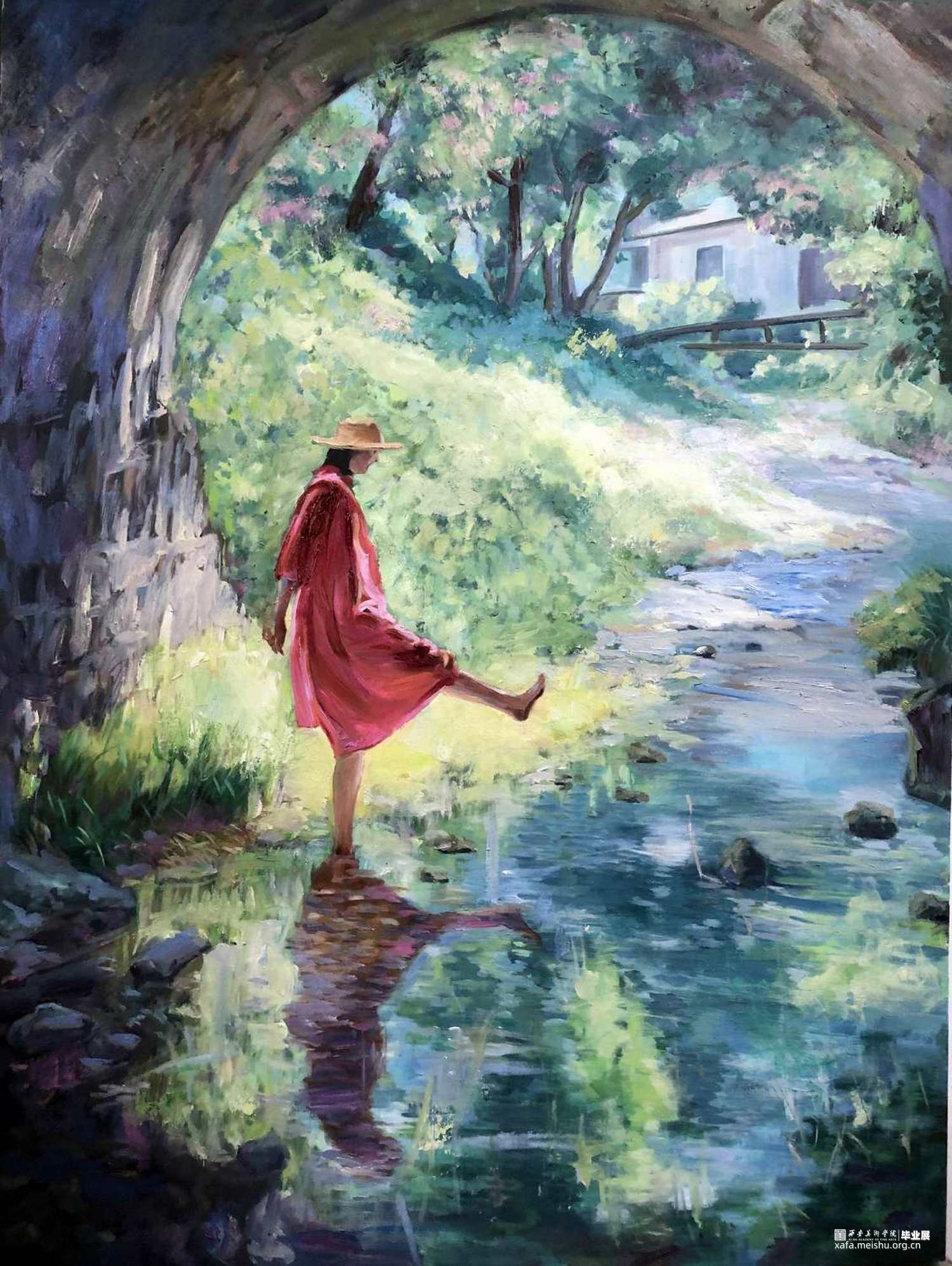这张创作我把它命名为《那年夏天》。画面是一位红衣少女在夏日涵洞下的溪水边驻足的场景。夏日明媚温暖的阳光洒在流淌的小溪上,洒在郁郁葱葱的植被上。由远及近仿佛能感受到阵阵清风从树梢和青草间吹过,波光粼粼的的溪水蜿蜒着从少女的脚边流过,就好像时光匆匆而过,而青春的美好与恬静却永远停留在夏季的这一刻。涵洞与水面上的倒映仿佛给这个场景镶嵌了一个让时光驻足的相框,把这一刻的美好定格在少女踢起水花的曼妙时刻。不禁让人回味起曾经的那个夏天和自己远去的青春……