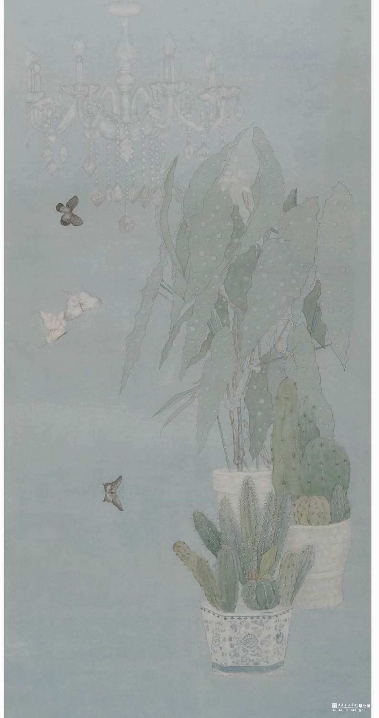 水晶是纯洁高尚的象征,水晶灯饰同样代表着光明和希望。仙人掌的品质为坚强不屈,内柔外刚,绿色新生。蝶有着顽强的生命力蝴蝶是自由的象征。我在这副创作中由这些元素组成,其希望与自由,一切都是欣欣向荣,生机盎然的样子。