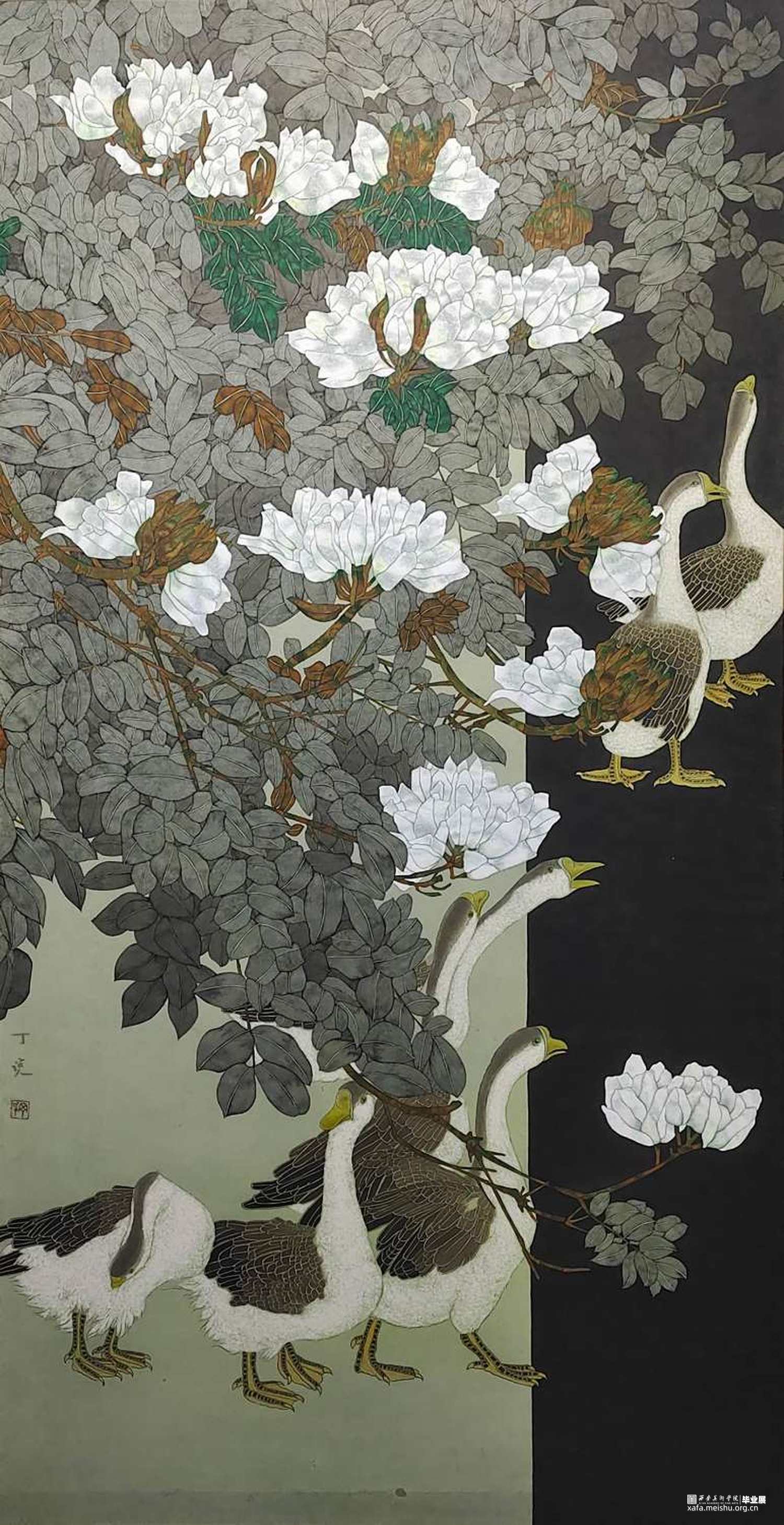 冬天的版纳一片春意盎然,百花盛开,硕大的火焰花开得非常热烈,我在这副创作中去掉了火焰花火红的色彩而取其素像,描述了一种恬静的庭院小景,来表达时光静好。