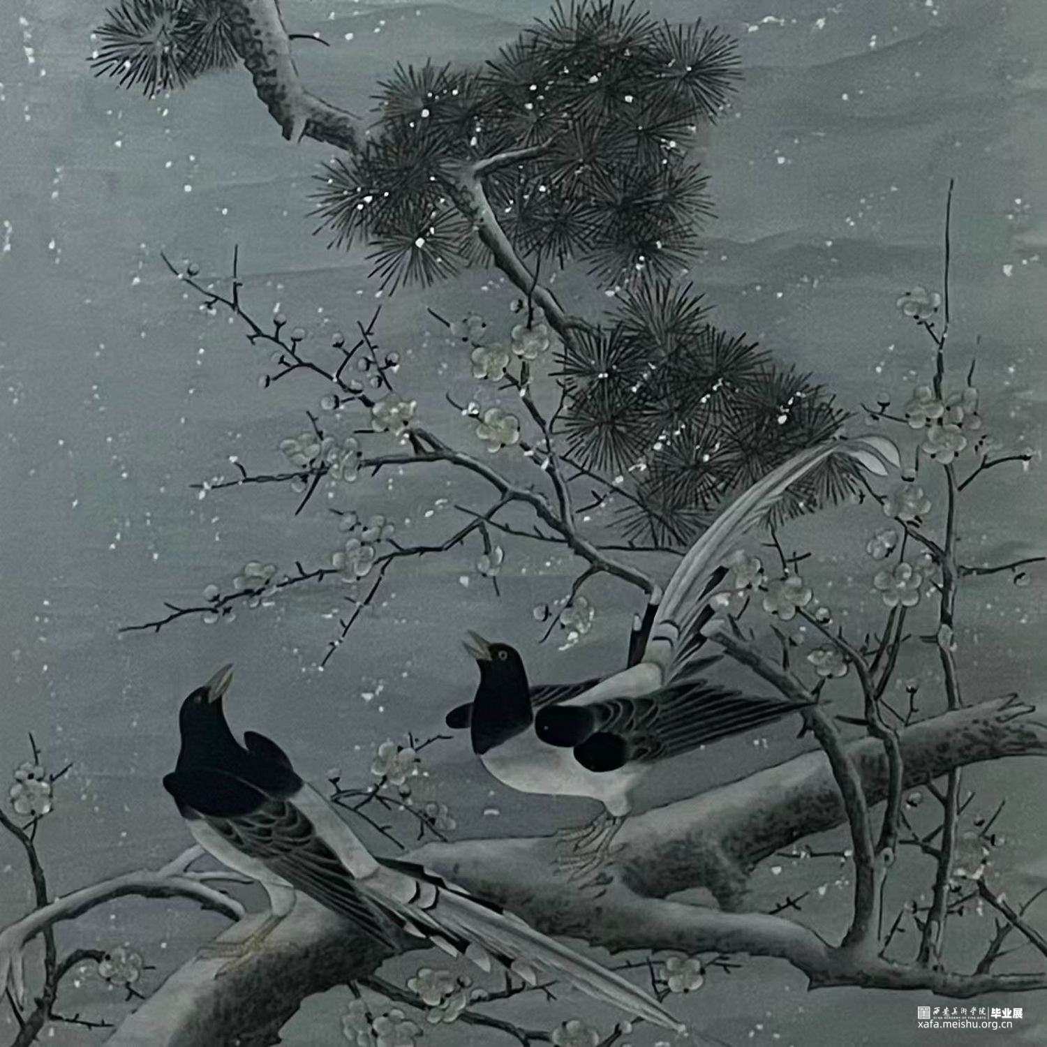 《雪雀》这幅工笔花鸟题材创作方向是想通过大雪纷飞中几只雪雀在梅花与松柏枝头悠然自得的画面表现,用没骨的绘画技法,给人傲立雪中,遗世独立的感觉。画面富有生命力,松树青翠,梅花盛开,几只雪雀不畏严寒立在树梢。整幅画面体现出坚强,不会害怕任何困难的品质。