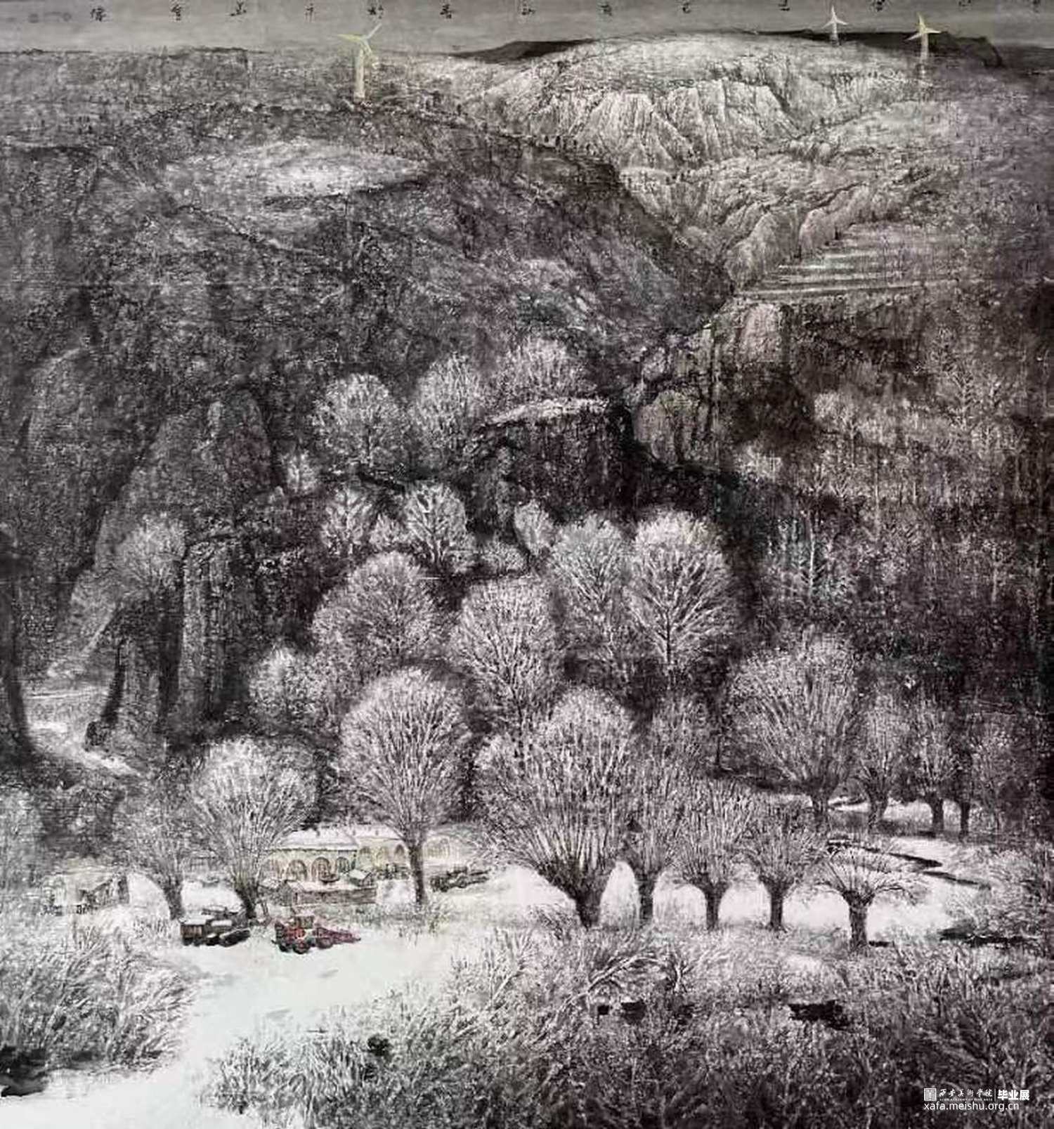 张金伟的国画油画大部分以陕北黄土高原地貌,人文,地理,新变化,新发展为题材,通过对原题材的构成,概括,提炼,用绘画直奔黄土地文化的主题—高原,沟壑,久经风霜老树木,老窑洞,红辣椒,放羊老汉,远处的水利农田,油气开发,风力发电,光伏发电等…上世纪80年代到本世纪2020年之间农村人家,农具,生活方式的发展变化,人们精神面貌的新发展…引起读者的无限乡愁与怀念…讴歌中华民族文化发展与传承,绚丽与繁荣的精神家园…