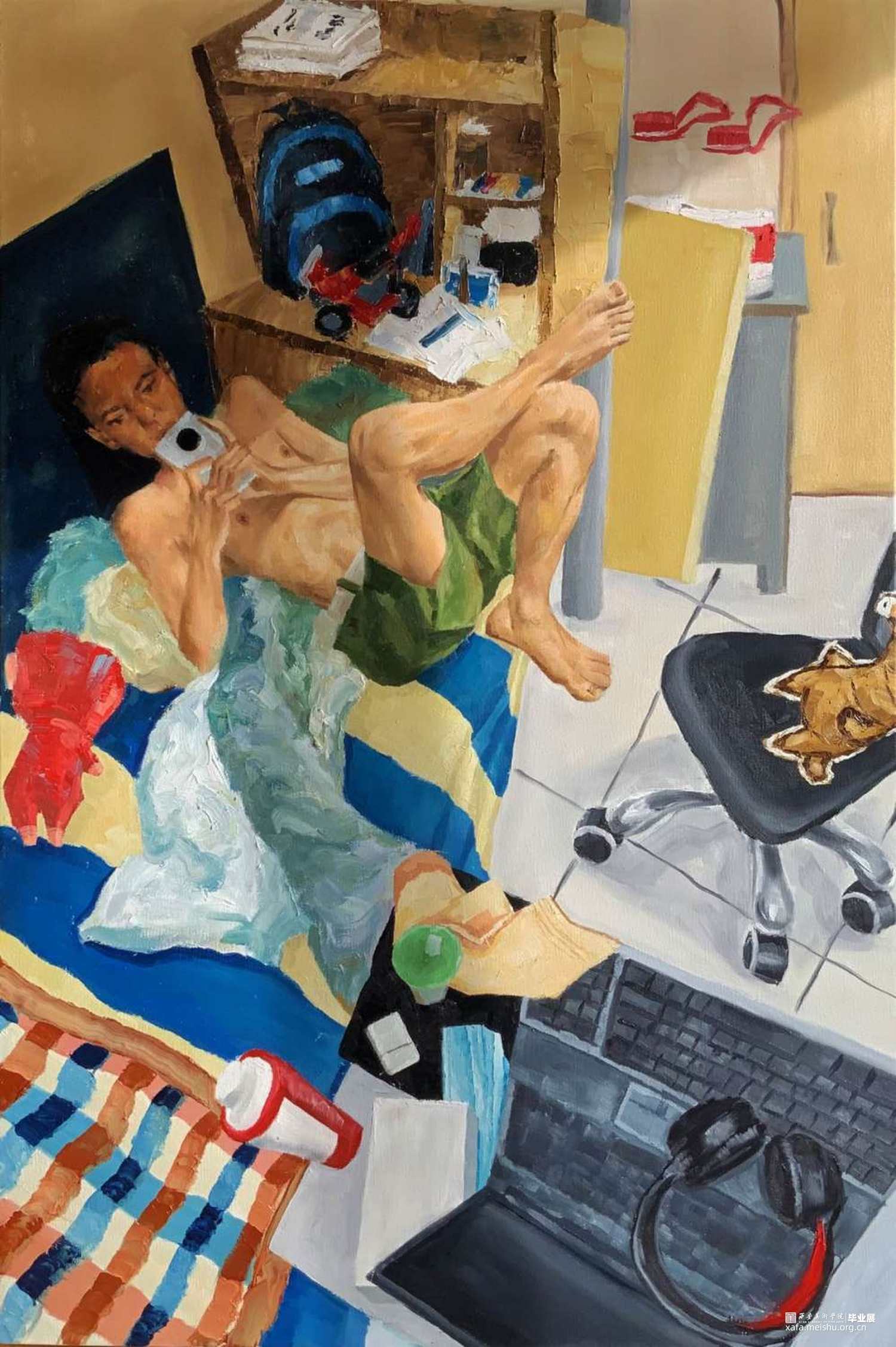 该作品名为 《开摆》,其内容参考为我的一位室友在宿舍摆烂时的状态,所以整体画面采用了相对放松和夸张的方式来进行创作,主旨是为了表现当代年轻人在放松休闲时会沉浸于自己的世界从而对周遭环境的不敏感,沉迷于自己的世界中而不受外界的影响,不由自主的展现出最为悠然自得的自已。所以我在整体相对放松的画面中加强了人物的塑造与刻画,并对周围的环境进行模糊或者是放松的处理,以及对周遭物体进行夸张的透和一定的形变,从而展现自己创作的主旨。