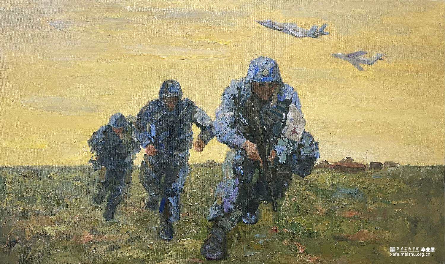 油画《最可爱的人》描绘的是空军官兵战备训练的场景。清晨,晴朗的天空传来飞机的轰鸣声;广阔无垠的地面我们的官兵在奔跑。作品努力从日常训练的角度诠释当代军人阳刚之气,抒写奉献精神。虽然只是一个瞬间,却让观看之人了解到中国人民解放军献身使命的钢铁雄心和决心。画面人物虽然不多,但他们奔跑产生的力量和坚毅的神情能让观看之人肃然起敬。养兵千日,用兵一时。画面中的战士代表了千千万万个解放军官兵,正是因为有他们无私奉献精神才有我们当前的美好生活,也提醒人们好好珍惜。本人是想借用油画的特殊语言来表达对军人深切的崇敬之情。