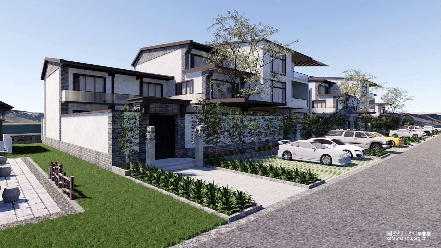 建筑效果图:整体以关中传统建筑布局为主,通过点缀传统元素让建筑不失传统建筑文化。